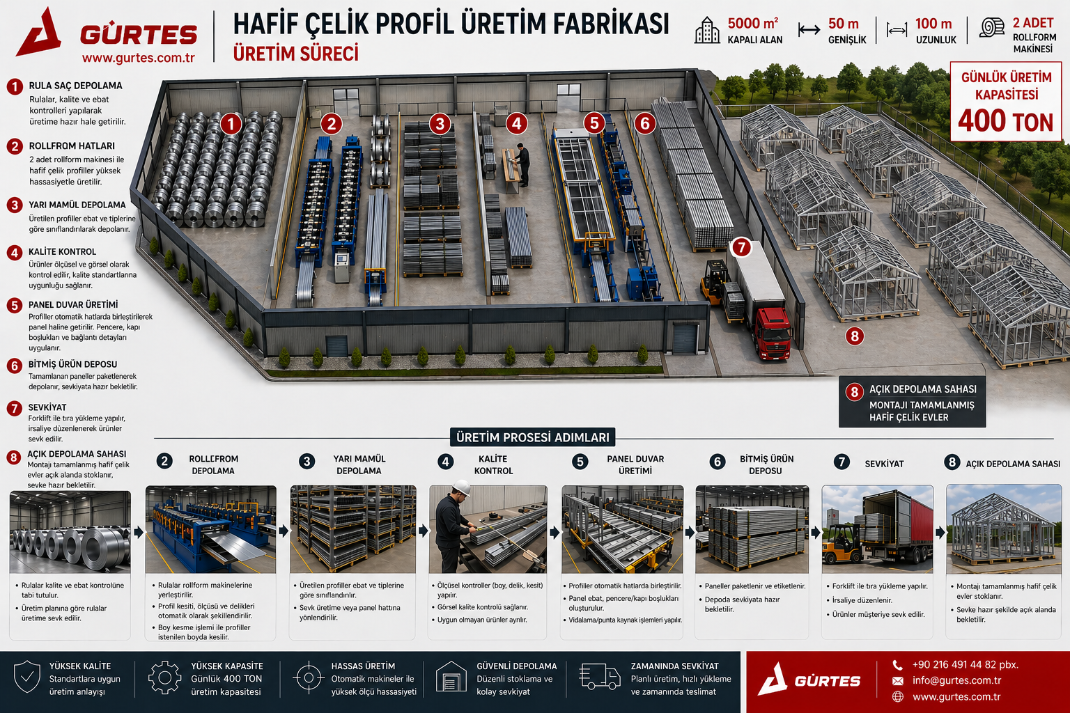 Modern üretim teknolojisi ve güçlü mühendislik altyapısı ile Gürtes, anahtar teslim çelik ev projeleri, hafif çelik villa modelleri ve şantiye yapıları üretiminde yüksek kalite standartları sunmaktadır.